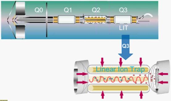 QTRAP由3個四極桿組成,特殊性在Q3,Q3既可以作為四極桿使用也可以作為線性離子阱來使用,因此具有這兩個儀器的特點。QTRAP的工作原理就是,Q0中第一次捕獲、富集離子,Q1中選擇母離子,Q2中碰碎,Q3捕獲、富集后質量掃描。采用多重EPI(增強子離子掃描)可以檢測共流出的代謝物。經過試驗發現QTRAP的EPI全掃描的靈敏度比普通PI(子離子掃描)的靈敏度高出500倍,即使含量很低的物質也可以檢測出來。